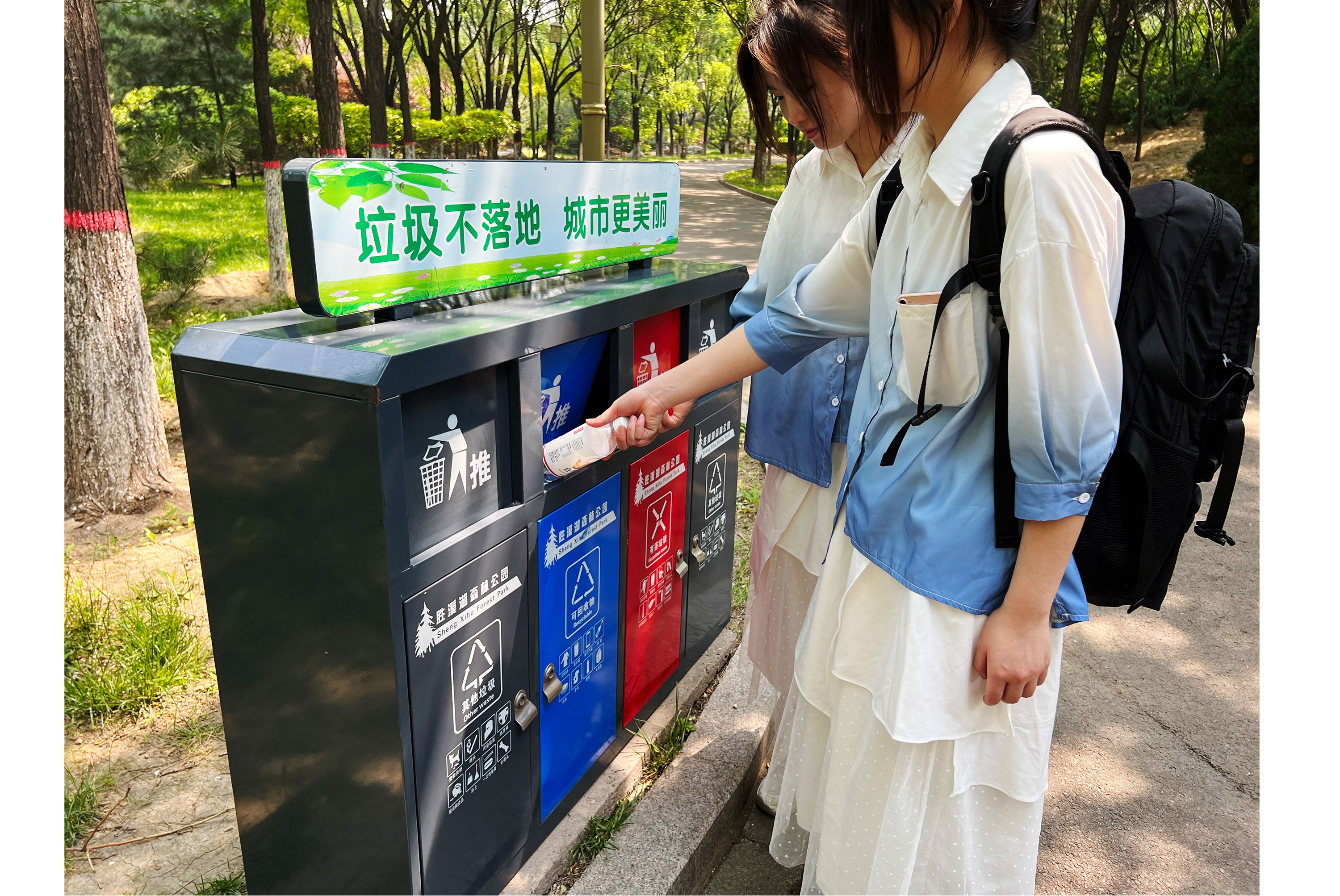 游客正在分类处理垃圾