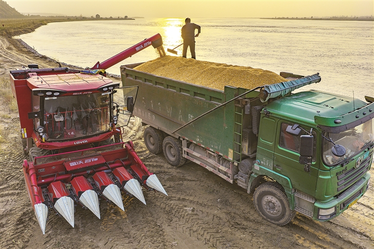 图②为11月2日,在河南省三门峡市灵宝西阎乡黄河岸边,收割机把抢收的玉米装车(无人机照片)。 杜杰 摄