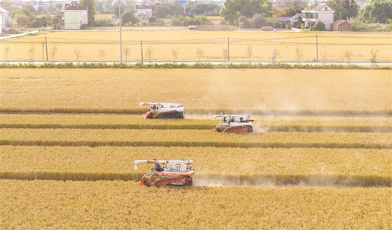 图①为11月3日,江苏省南通市通州区石港镇四港村农民驾驶收割机抢收水稻(无人机照片)。