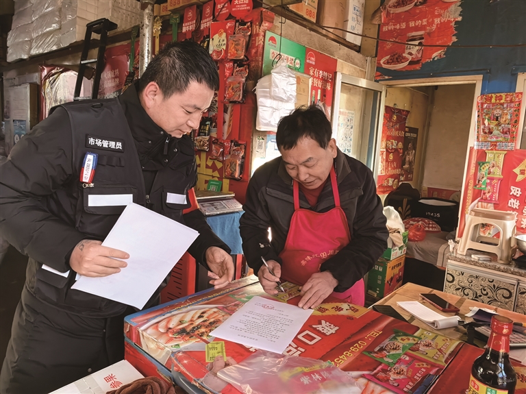 初冬,清晨七点的市区马茂庄长青蔬菜瓜果综合市场,早已是人声鼎沸。崔雪斌穿着印有“市场管理员”字样的深蓝色工装背心,手里拿着消防安全责任书,正弯腰查看商户付来云摊位下的灭火器。“付大哥,这段时间气候干燥,晚上要关闭电源,检查好电源线路,防止火灾发生。”付来云连忙放下手中的秤,连声说道:“多亏你天天盯着,我这忙起来真容易忽略这些细节。”这样的对话,是崔雪斌日常工作的缩影,也是我市对经营场所加强消防安全治理落地见效的生动注脚。