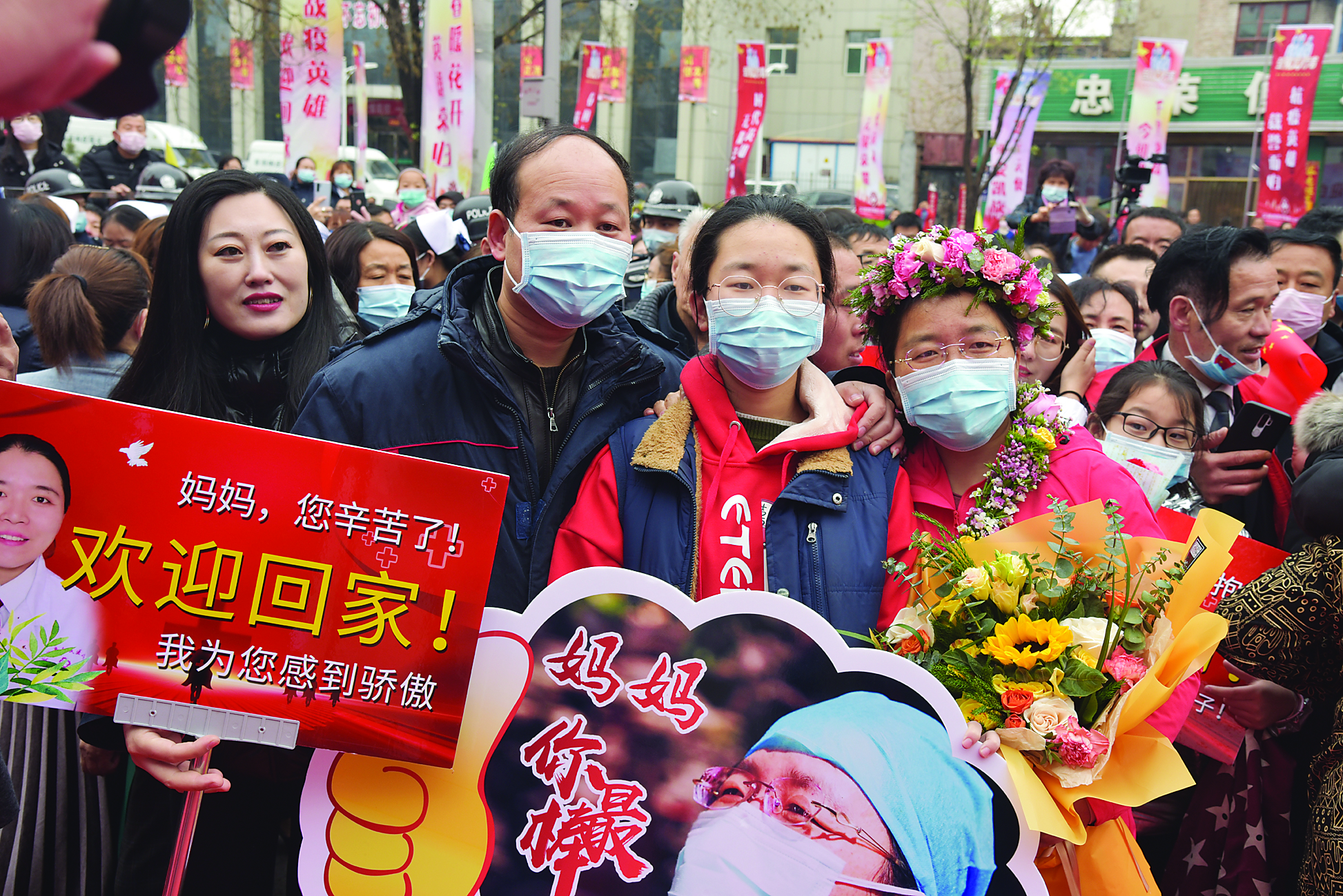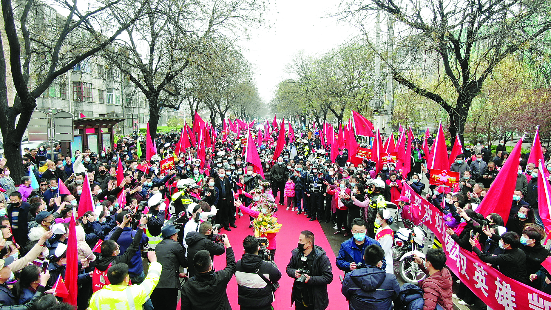 曾记得,在一场飘扬的春雪后送你们远去,心中默默唱响那首歌:送战友踏征程,默默无语两眼泪,耳边响起驼铃声,路漫漫、雾茫茫,革命生涯常分手,一样分别两样情,战友啊战友,亲爱的弟兄,当心夜半北风寒,一路多保重。送战友踏征程,任重道远多艰辛,洒下一路驼铃声,山叠嶂水纵横,顶风逆水雄心在,不负人民养育情,战友啊战友,亲爱的弟兄,待到春风传佳讯,我们再相逢……而今,那霏霏的雨雪洗涤后的交城,柳叶如碧、桃花似锦,不正是上天为迎接她们凯旋所赋予的最高规格的礼赞吗?更别说旌旗列队、警车开道、倾城夹道的空前场面,无数的鲜花、掌声昭示了全县23万人民对这三位抗疫英雄深情的崇拜与敬仰!