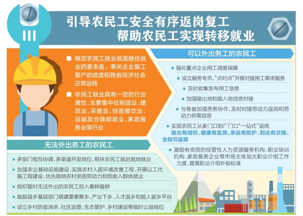 稳定农民工就业就是稳住就业的基本盘。农民工返岗之路是否畅通、就业形势是否稳定,不仅直接影响农民工的工资性收入特别是贫困劳动力增收脱贫,还事关企业复工复产的进度和我省经济社会正常运转。 如何引导农民工安全有序返岗复工,帮助农民工实现转移就业是疫情发生以来我省稳就业工作和2020年决战决胜脱贫攻坚的重点工作之一。近日,我省发布《关于统筹推进疫情防控和稳就业工作的通知》(以下简称《通知》),进一步“引导农民工安全有序转移就业”。