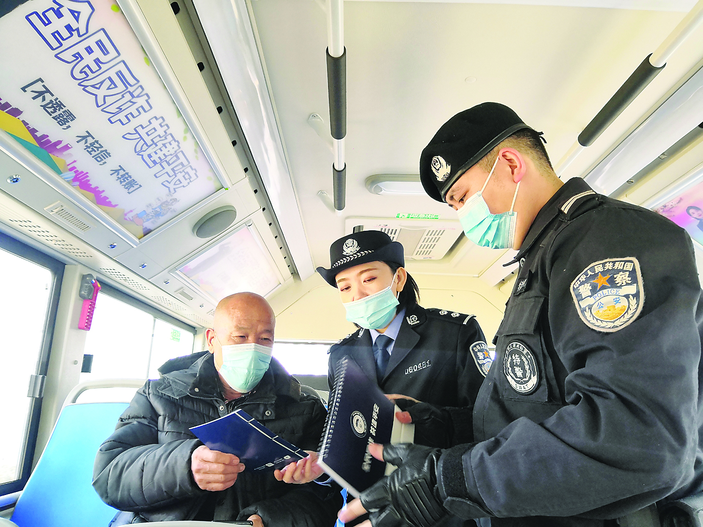 图为市公安局反诈宣传民警为市民讲解反诈知识。2月份以来,市区部分公交车车身换上全新的反诈公益广告,车厢内部摆放各类典型诈骗套路宣传单,更有反诈宣传民警与乘客面对面答疑解惑。连日来,首批反诈主题公交车陆续驶出吕梁市长途汽车站,在为市民提供出行服务的同时,以特殊的方式唤醒民众的防骗意识。沿途乘客可以利用坐公交车的碎片时间,随时获取反诈防诈小知识,提升全民防骗意识。